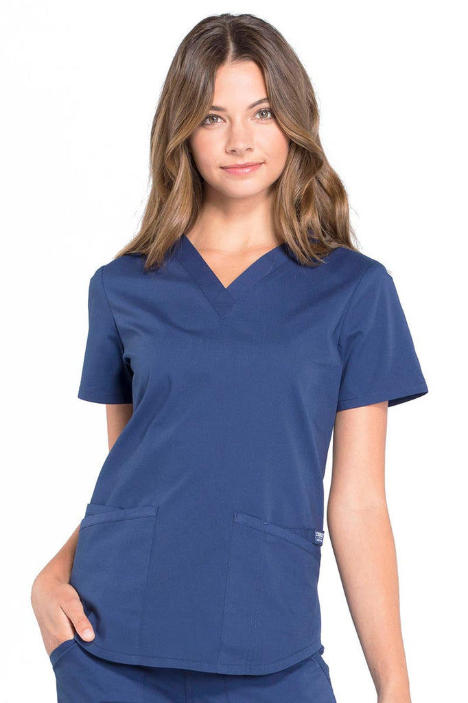 Pantalón para dama Cherokee Work Wear Revolution, tejido flexible con estiramiento en ambas direcciones, durable, resistente a la decoloración, muy suave, cómodo y de fácil cuidado de lavado.